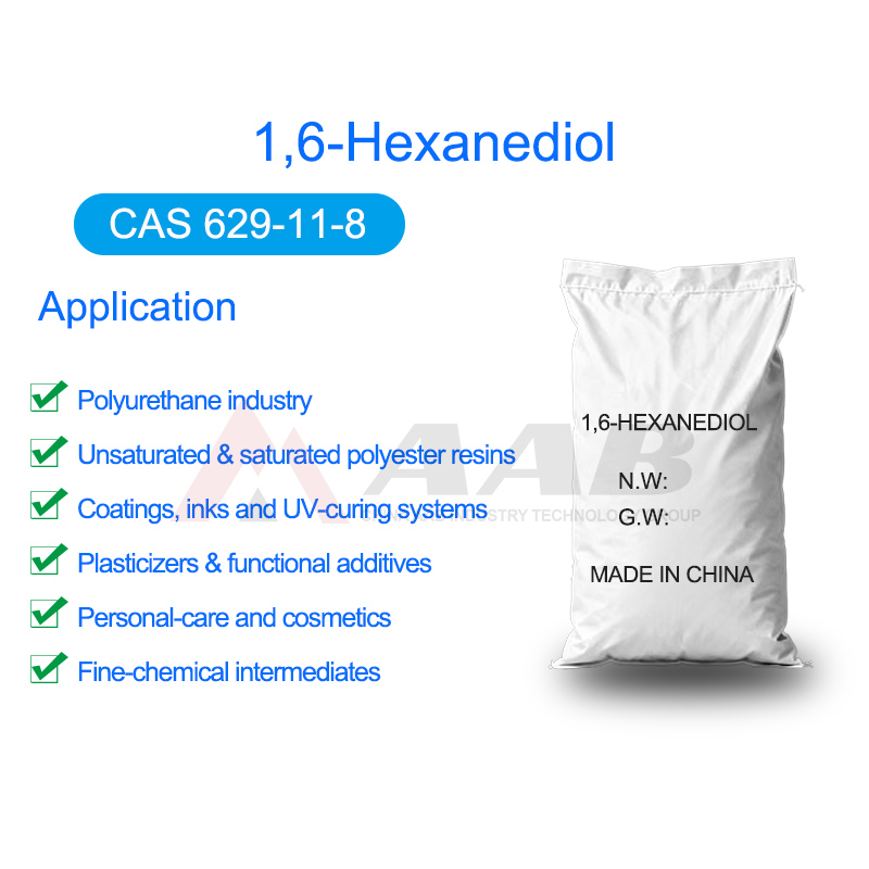 El 1,6-hexanodiol es un sólido cristalino incoloro, higroscópico, soluble en agua y de baja toxicidad, ampliamente utilizado en la producción industrial de poliéster y poliuretano. También se le conoce con los sinónimos hexano-1,6-diol, 629-11-8, hexametilenglicol, 1,6-dihidroxihexano y hexametilendiol. Nuestro 1,6-hexanodiol generalmente actúa como un componente básico para resinas de poliéster y poliuretano, adhesivos, también el 1,6-hexanodiol se puede utilizar como intermedio de síntesis orgánica, agente de acoplamiento de tintes, plastificante ecológico sintetizado, formulación de tinta de impresión, pintura y adhesivo.